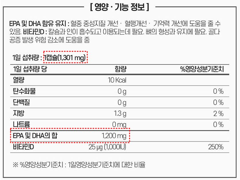 오메가3 박스뒤의 영양 기능 정보표나 원료함량표를 확인합니다. 대부분은 1 캡슐 1,301mg라고 쓰인 숫자를 광고합니다. 이것은 1 캡슐의 모든 성분을 더한 용량입니다. 중요한 것은 실제 오메가3의 함량인 EPA 및 DHA의 합을 봐야 합니다. 1200mg가 핵심입니다.